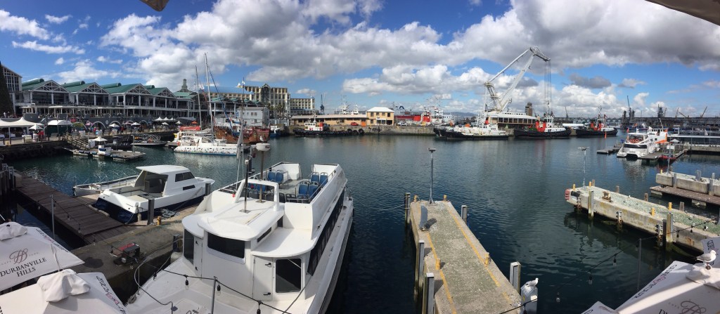 Day 3 in Cape Town was our chance to explore the V&A Waterfront area (Victoria & Alfred), and we had lunch scheduled down at the old Biscuit Factory district……..eating at The Pot Luck Club, sister restaurant to Test Kitchen (#1in the world). V&A surrounds the harbour for fishing, touring, and pleasure craft, with the big commercial harbour just down the road.