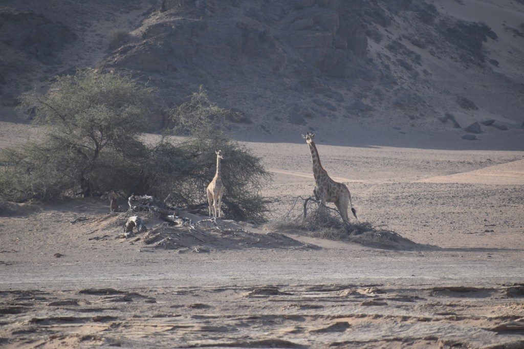 Rocky gave us the run down on the way to the camp, explaining that although they have very small herds in this area, all the usual suspects were here………it was just a case of finding them. The life blood of the area is the Hoanib River, now a totally dry dust bowl, but when the rainy season comes, it can become a raging river in seconds. The vegetation we saw from the air are the trees and bushes that grow along the river which have adapted to these harsh conditions, some with root systems that are 30-50 meters deep. Finding a way to survive in this area is as much a challenge for the vegetation as it is for the animals and birds.