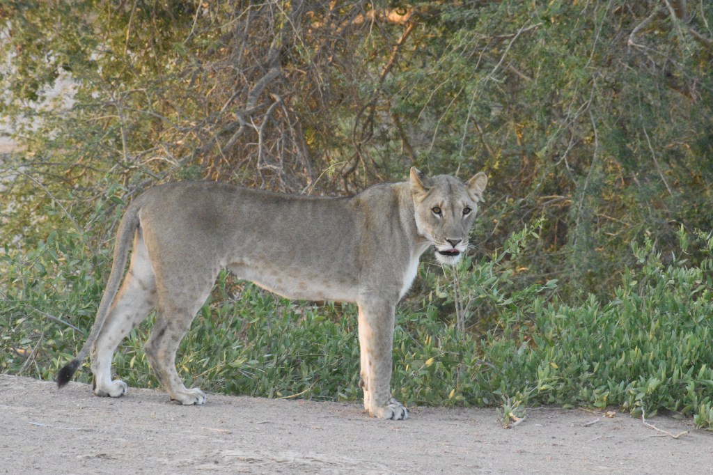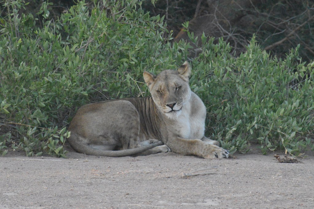 As luck would have it, I managed to spot a lion high on the riverbank above us. I truly wasn’t sure until we stopped and backed up, but then clear as day, half hidden by some low branches, were those distinctive ears and half a head exposed above the bank. Rocky turned around to a spot where he knew we could climb out of the riverbed in the truck, and within minutes we were sitting twenty feet away from two lioness, familiar to Rocky and know as #69 (the auntie) and her niece an unnamed two year old. Sundowners were served in the truck as we couldn’t pull ourselves away from the sight of our first big cats in Africa. These were two of only four lions known to inhabit this area……the other two were sisters of the niece and had moved closer to the coast to feed at the seal colony……….the short story on why so few lions remained here is that five young males were either killed or poisoned by neighbouring villagers trying to protect their cattle, and the actual mother of the three nieces was killed in a fight with a leopard where both big cats died……..after a lot of coaxing by the nieces, the auntie finally agreed to adopt the girls and share her kill with them.