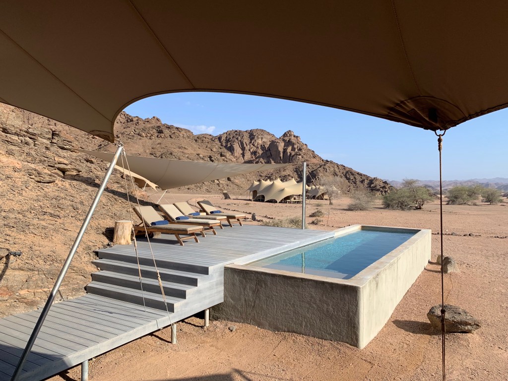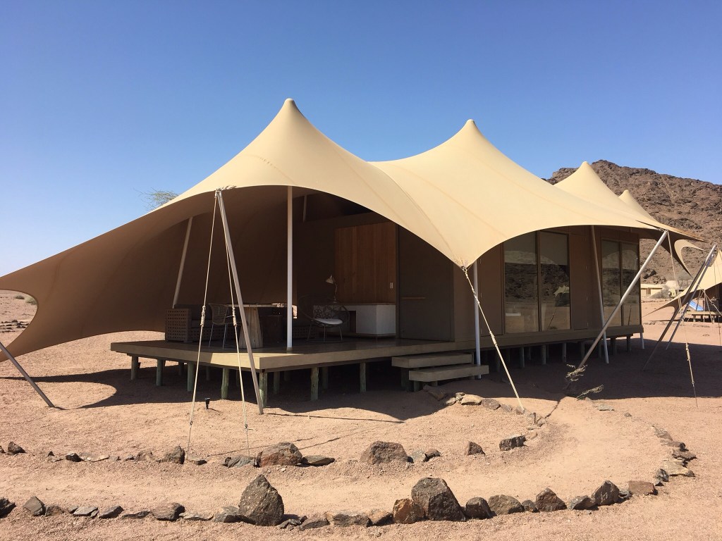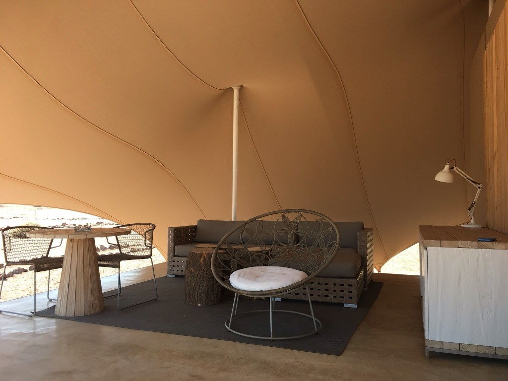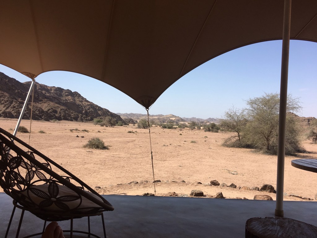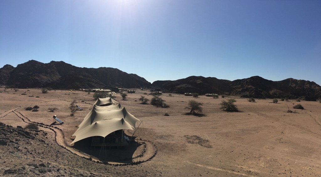 Arriving at camp, we were surprised to find a very modern looking group of tented buildings, strung out across a narrow valley. The camp was just four years old, 8 individual suites, a main lodge, and another building used by researcher Ettie who was working on a brown hyena project and lived at the camp. Her husband Philip has been studying the desert lions in the area for over twenty years. They all wear tracking collars, and have been the subject of two documentaries………amazing but ultimately sad stories…….more on that later.