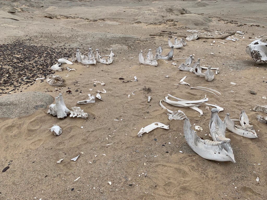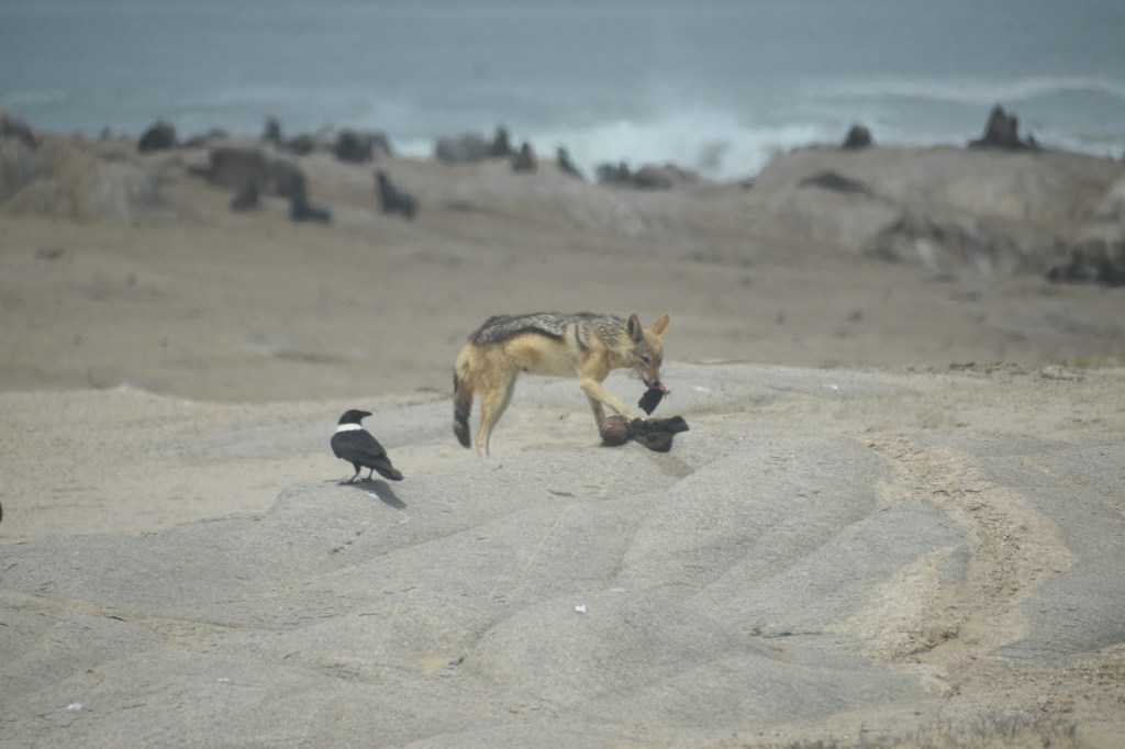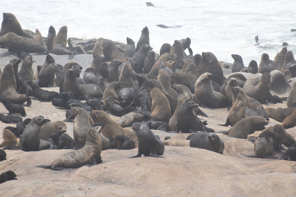 Arriving at the coast we were greeted by that all so familiar smell……..oh yeah……remember it well from Antarctica, South Georgia last year, seal poop. Quick stop to look at some of the skeletons, visit a shipwreck, spot a rare brown hyena (Christiane), before settling in to wild kingdom at its best, the seal colony. Thousands upon thousands of fur seals along the rocky coastline with the south Atlantic breaking bad in the background. Bulls fighting to protect their territory and harems, cows delivering pups right before your eyes, pups dragging themselves around smelling for mama with umbilical cords still attached, vultures and jackals preying on the young, contributing to the 50% survival rate for pups in this colony. What a site. The smell, overwhelming for Christiane, but old hat for Jutta and I who learned mouth breathing techniques last year and did well. Nobody hurled, so it was all good. We had hoped the other two lion cousins or the brown hyena might show up for lunch, but they were probably comfortably resting after a big breakfast……….total smorgasbord for the predators on this shore.