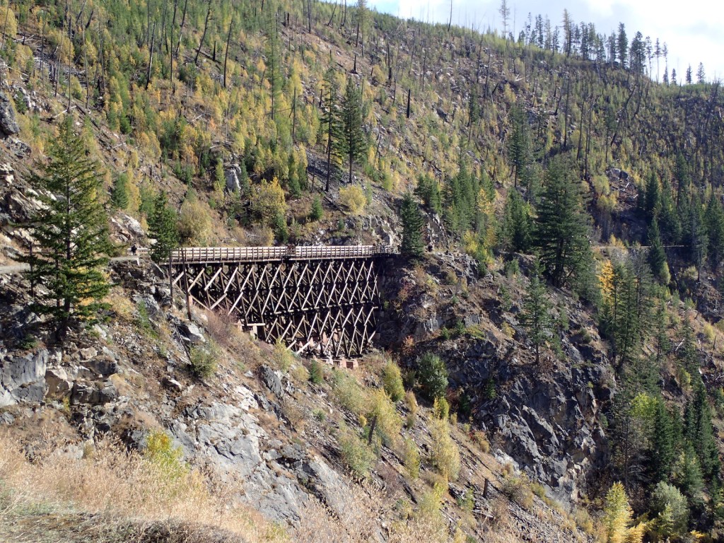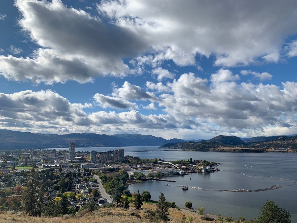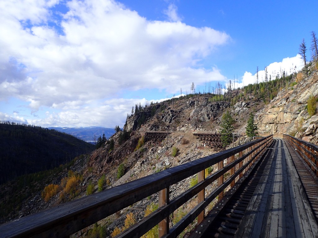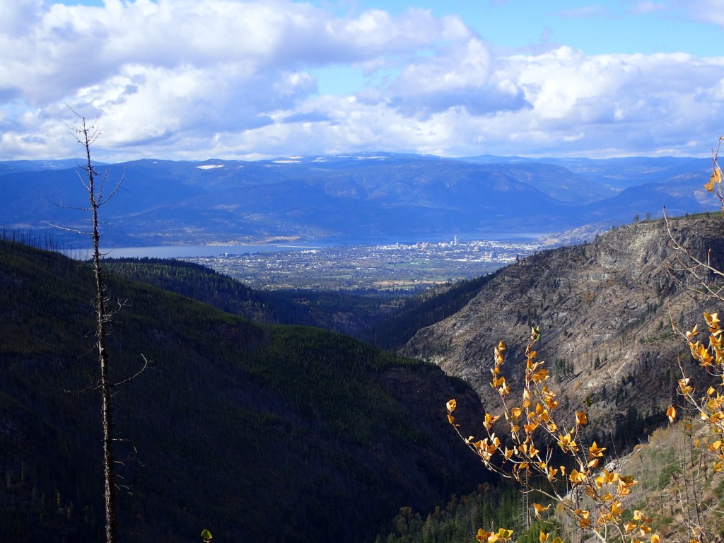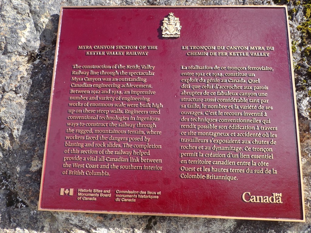 Today we have planned a later start due to some rainy weather in the forecast, planning to rent/ride bikes up on the Myra Canyon Trail which features a number of railroad trestles. Our plans fell apart a little when the rental guy called in the morning to say what was rain in Kelowna last night, was snow up in Myra Canyon, and he wouldn’t be opening today as the trail and trestles would be too dangerous. Sam called to say they would be taking Fernie for a walk in Knox Mountain Park adjacent to downtown, and we decided to follow along. Jutta was in Kelowna with the GBC girls last spring, and knew the route up Knox……..steep initially, but then it levelled out a little…….beautiful views the whole way. A quick Starbucks stop followed, then we were off to Myra Canyon.