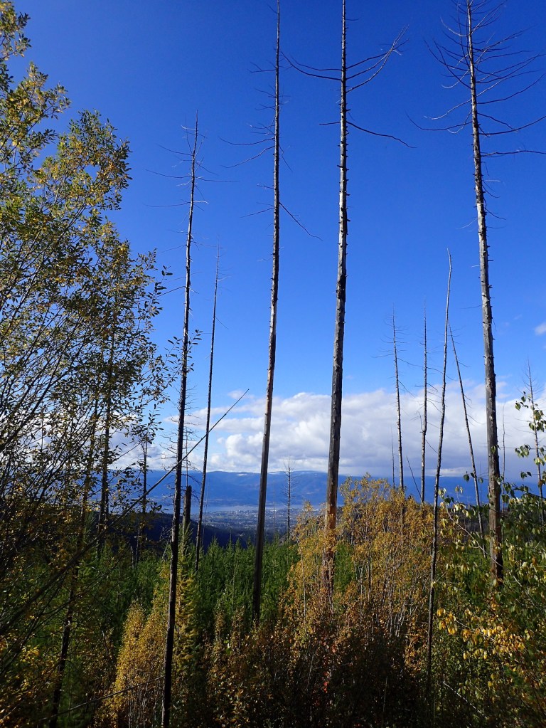 Sometimes the GPS doesn’t take you exactly where you want to go……..with me in the lead, 8km up a muddy, washboard, dirt road, we ended up at the wrong end of the trail………back down, traverse across the bottom a few km, then back up another dirt road for 8km. This is a busy spot this weekend, and in a few minutes we would see why. Initially stunning distant views of Kelowna, followed by the deep canyon with train trestles all around, and evidence of the 2003 Kelowna Mountain fire which scorched everything in the area, including the trestles. Luckily they have been rebuilt and are now one of the top attractions in Kelowna.
