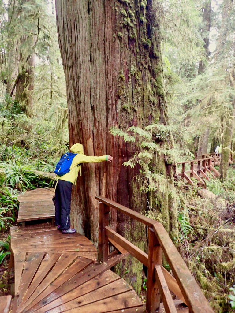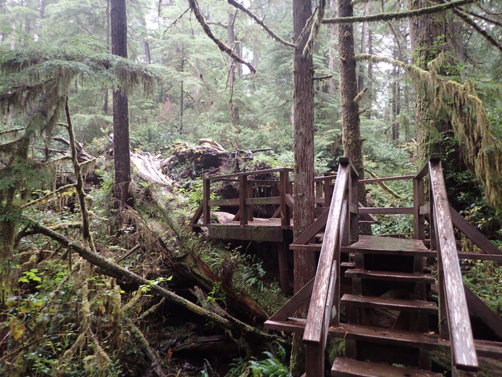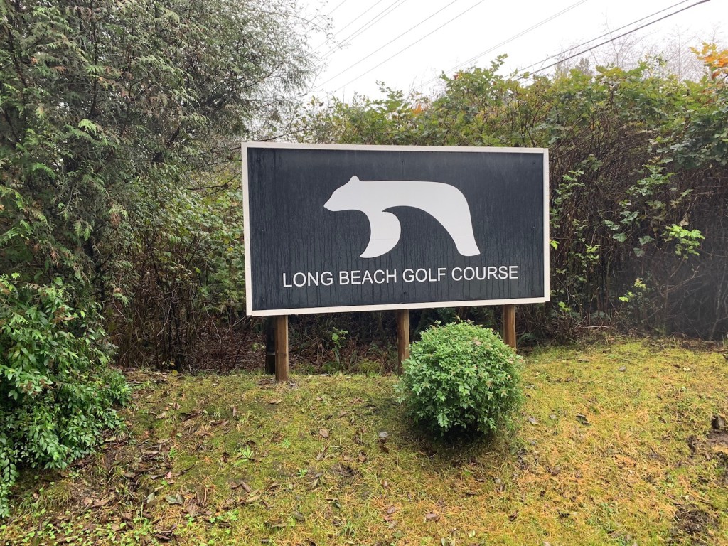 Back to the ranch to drop the clothes…….still raining……and we have decided to go for a hike……two short loops through the rainforest about twenty minutes down the road. This is another boardwalk hike, keeping all foot traffic off the forest floor. Again we are treated to massive growth, huge nurse trees, and lush greenery everywhere. One sign tells us that the Pacific Rim Rainforest receives 120” of rain per year, compared to 60” in Vancouver, and 11” in Princeton (south BC interior). By now though, I and feeling like a fair bit of the annual is running down my back. We do a couple of side roads on the way home and check out Brice Bay,and the local links, Long Beach Golf Club. I think it’s a nine hole course but there is nobody around to ask………hmmmm……maybe because of the RAIN.