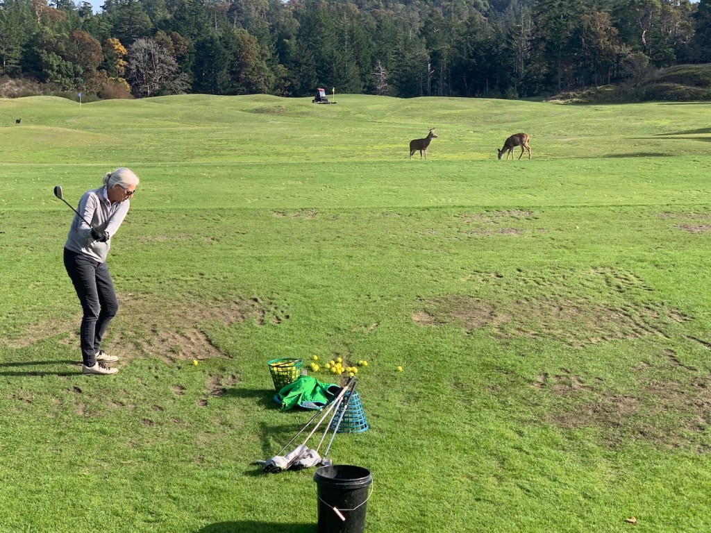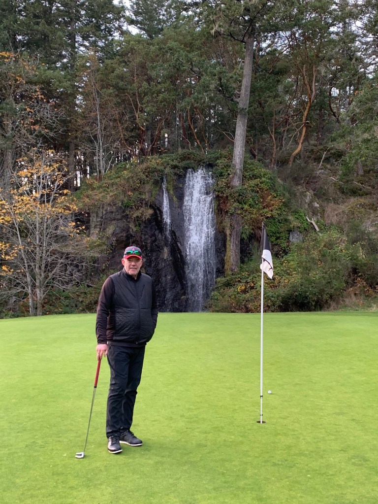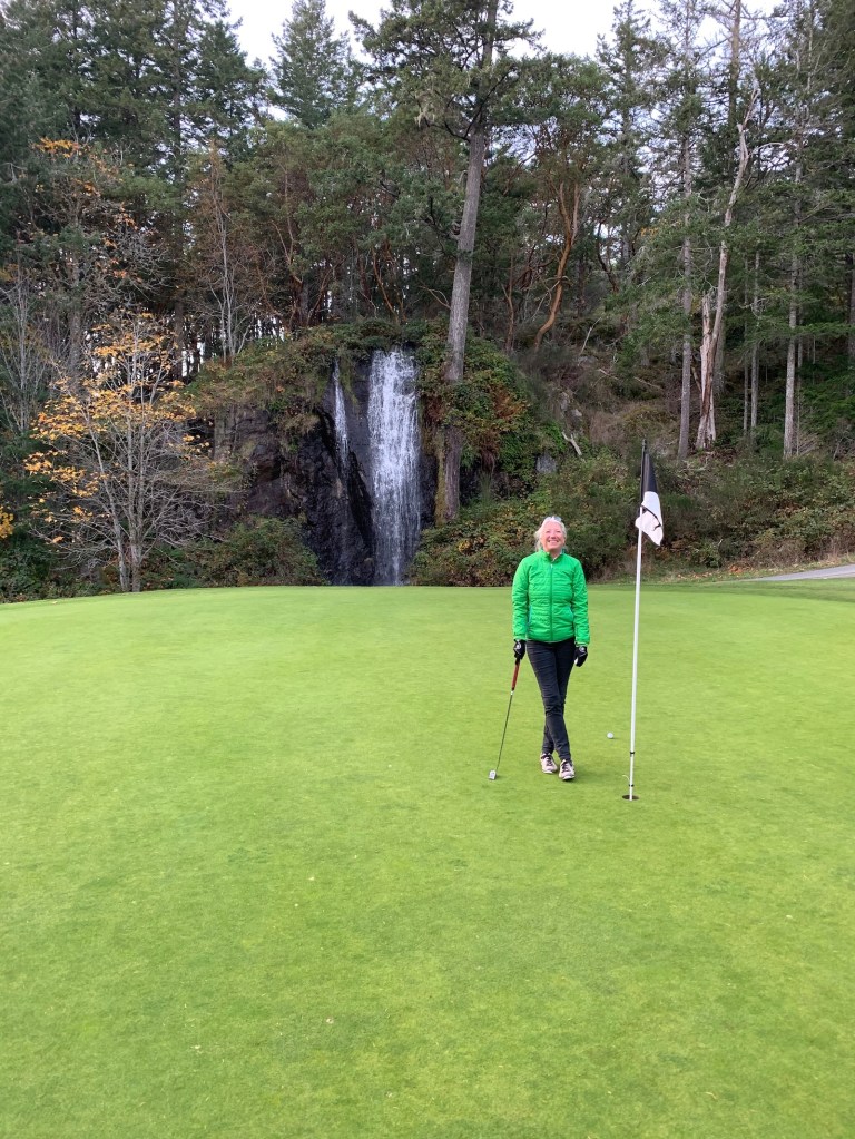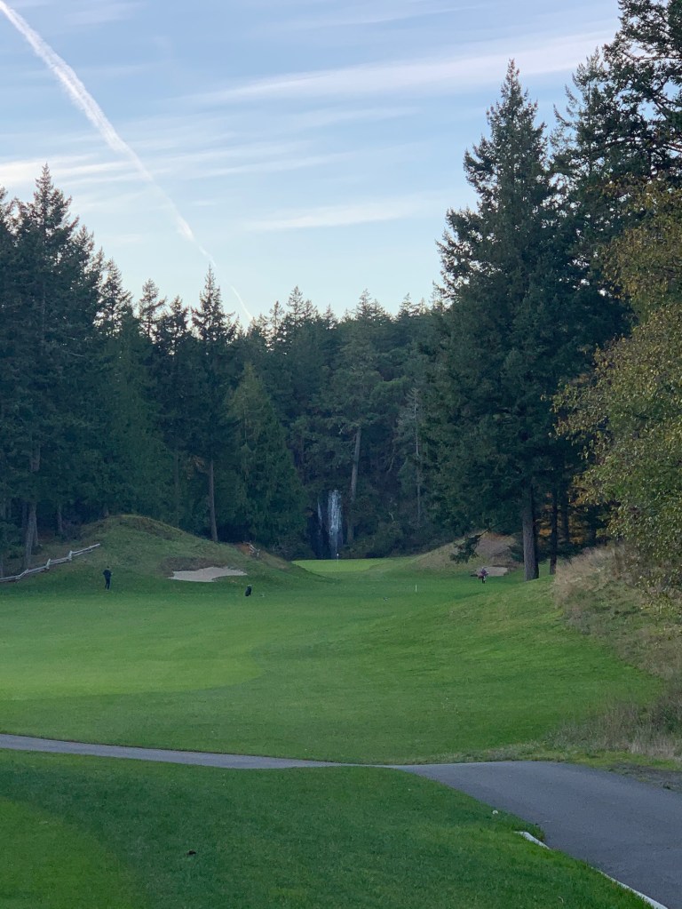Our arrival to Olympic View is timed perfectly to allow for a quick lunch and some warm up balls…….really nice, newish clubhouse with a solid menu, good selection of beers on tap, great service, need I say more.  Fish and chips is always a good bet, especially when it is fresh halibut……delish, and awesome homemade fries and coleslaw on the side.  We go down to the range and whack a few balls, but really just want to get out on the course while the sun is still shining…….nice and warm in the sun, about 12 degrees, but the shade is brutal.