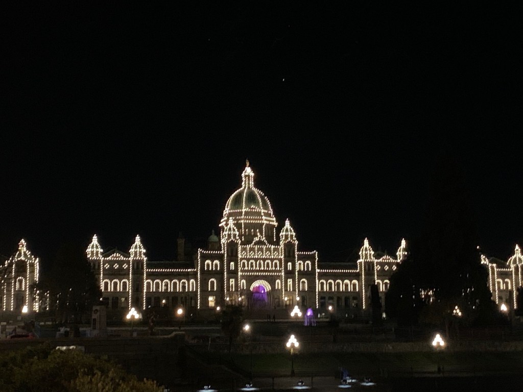 Heading back to town, we have no dinner plans…….we discuss the options we have on board in Plan B’s freezer, and there is always Kraft Dinner and beans if all else fails.  Jutta is on the phone in an instant, and we secure a reservation at Finn’s (our lunch spot with the salmon burgers) because we know….#1 where it is, #2 there is parking next door, and #3 I want some more of that seafood chowder.   Absolutely great call by Jutta.  We notice on the way into town that the Legislature Buildings are lit up beautifully, so a photo op is in order…….I send Jutta……..someone has to drive???  No problems getting home, and we are sacking out after another long day……ok I watched 1 ancient Star Trek and a couple of Hogans Heroes before bedding down, but was happy to kiss the pillow tonight.