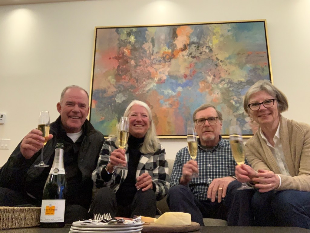 We have a quick turnaround back at Plan B…….shower, shave, put on the duds, and out the door heading over to Oak Bay to meet up with Kathy and Rick at their place……..gorgeous…….great neighbourhood east of downtown, and their place is right on Beach Rd. overlooking the Straight of Juan de Fuca. We go for a little beach walk and check out the hood, before returning to crack open the bubbly and the celebration begins. A surprise for Jutta is in the works, and her golf pals from GBC initiate a ZOOM call, and try to sing Happy Birthday online…….performance rating 7.5……..French judge 6.0……..my rating, a perfect 10, you guys are the best and Jutta loved it.