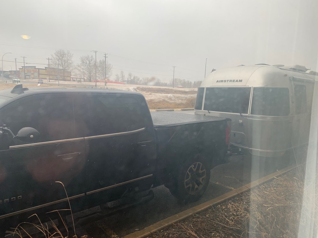 I planned to stop in Strathmore just east of Calgary, as I knew it for having good services right next to the highway. It was also time to take a closer look at the weather, as all reports were now warning of a very large storm brewing for the prairies, with travel advisories, blizzard warnings, only essential travel…….you name it, it was out there. Strathmore was -3, with drizzly stuff falling, and remnants of yesterdays snowfall still evident here and there, but the weather to the southeast towards Medicine Hat, was looking brutal…..the direction we were headed. We called a couple of RV parks in Medicine Hat and they reported deteriorating conditions. Weather websites, and the 511 road conditions were all super negative. There was an RV park a short distance away, but we just happened to be sitting 50 metres from the Days Inn…….I checked it out, and they said we could plug in Plan B around back but would have to take a room whether we stayed in the trailer or not. For a moment I thought about pushing through to Medicine Hat, and then realized I was putting it all at risk for a two hour advance in position.