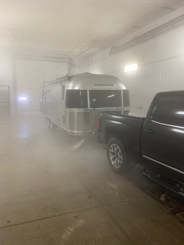 So onto the road we go, and although there is some improvement, there are still long stretches covered with snow pack and ice. It is not until Moosomin that things start to look a little better, and I decide to find a truck wash to clear off some of the debris from both the truck and trailer. We find this indoor truck wash on the edge of town……what a blast…….this is a car wash on steroids…….probably 80 feet long with 4 hoses, one in each corner and stairs for the truckers to reach up top. It made short work of the road grime, and we are back out there looking shiny and pretty once again………at least for a few minutes.