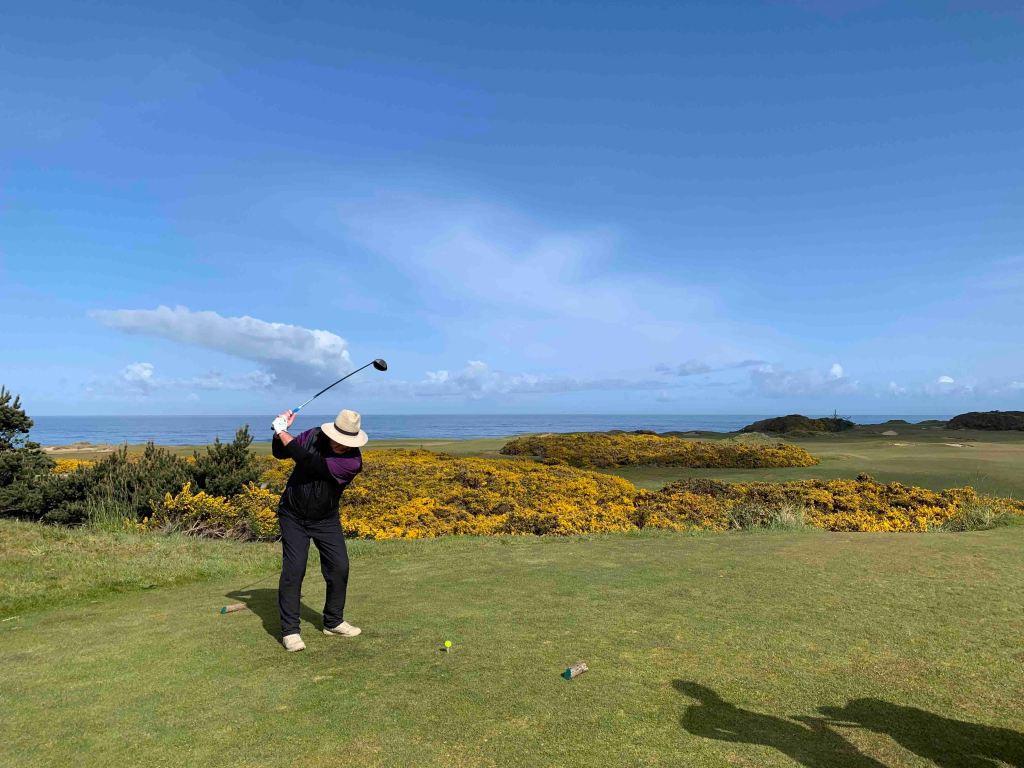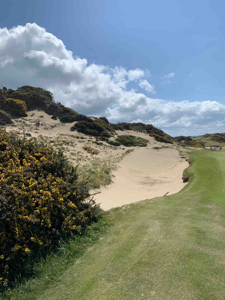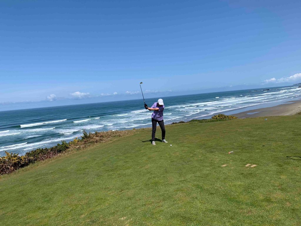 We are up early, and have a plan for the day………go back to Sheep Ranch for one of their incredible breakfast sandwiches……trust me, the best……..stop at the practice facility to warm up………this is a full on operation…….I’m guessing 100-150 tees for full shots, organized in two rows back to back, multiple chipping greens, bunker practice, and of course a couple of big putting greens……..awesome. Then it’s off to the course…….first up is Pacific Dunes, where, along with Bandon Dunes, they played the US Amateur last year or maybe the year before?? I have played Atlantic Dunes (by Davis Love) at Sea Pines in Hilton Head, and I have to say that Pacific wins this one hands down. Beautiful and difficult golf course. We have a quick 90 minutes between rounds, and decide to lunch at the next course, Bandon Trails, which features an Asian Fusion menu, great food, but you can still just get a hot dog if you like. Trails is an inland course……..heavily treed (evergreens) and undulating……..like something you would see in Muskoka, or out west in the Rockies. At one point you have to load on the back of a truck to get a ride up to the next tee box……..the story is that someone had a heart attack trying to make the climb on foot, so for insurance purposes they had to start using the truck……….I think thats a pile of crap myself, but I was thankful for the ride up the hill.