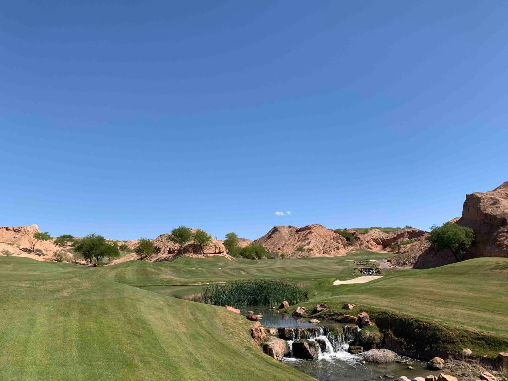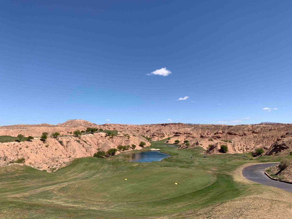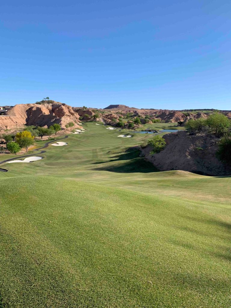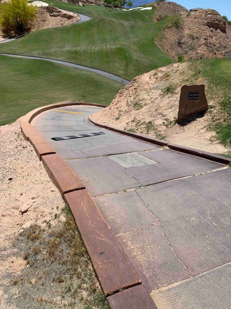 WITH ELEVATED TEES YOU GET A LOT OF STEEP RUNS BACK DOWN TO THE FAIRWAYS. WOLF CREEK IS FAMOUS FOR ITS CRAZY/SCARY CART PATHS……..THEY DON’T USE ELECTRIC CARTS BECAUSE THEY DON’T HAVE THE BALLS TO HANDLE ALL THE HILLS