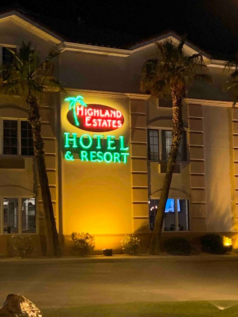 Dinner was becoming almost a daily problem unless we were cooking at home. You would think that good restaurants would be plentiful in this little gamblin’ town, but we can’t find them. One option we tried last night but was sold out was “Worden”, but tonight we are in luck……they have a table. On the exterior, big lit up sign saying Highland Estates Hotel and Resort, but nothing feels quite right about the property……….couple of elderly ladies outside (one with a walker) having a smoke, and asked if we were going to the restaurant.