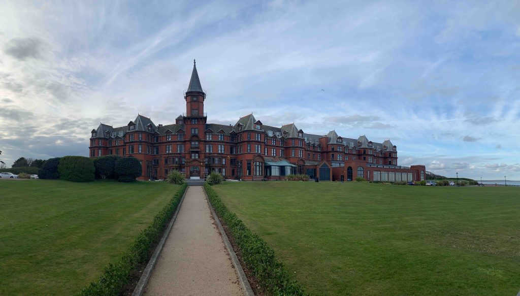 After a quick…….you guessed it…..Guinness, we hit the road and headed north, expecting a 90 minute drive to reach Newcastle. Having NAV in the car is making travel pretty easy, and we were door to door without a wrong turn in a breeze. Our destination is the Slieve Donard Hotel……literally across the parking lot from Royal County Down GC, the local jewell of golf courses that we will play in a few days. The hotel is under renovation after being purchased by a US group in 2021. Pretty special place, and will be ab fab when all done. We stayed on property for dinner choosing the Percy French, a restaurant/lounge bar located in a separate building close to the entry gate for the hotel. Fantastic.