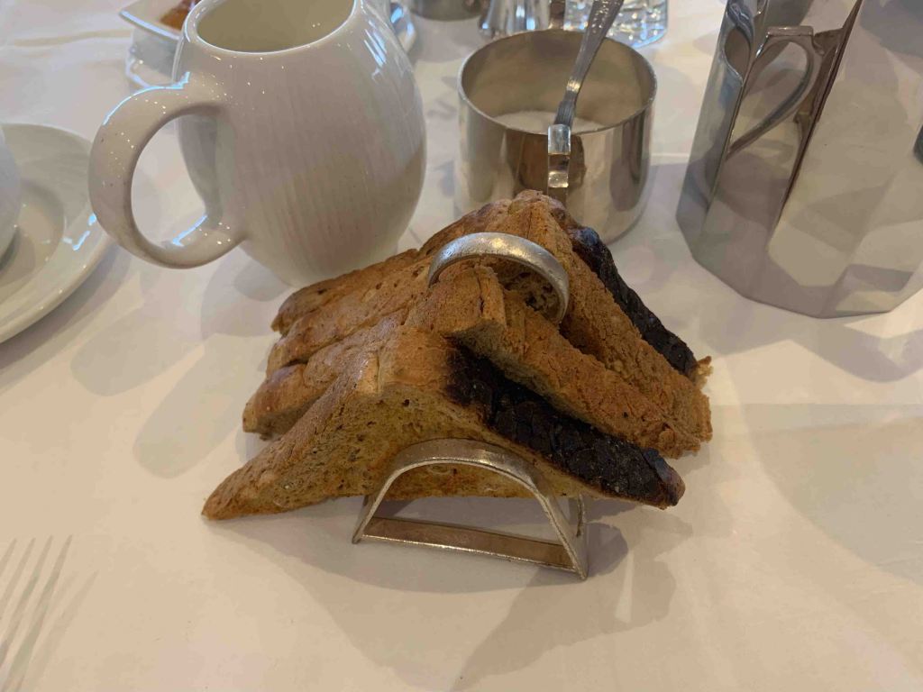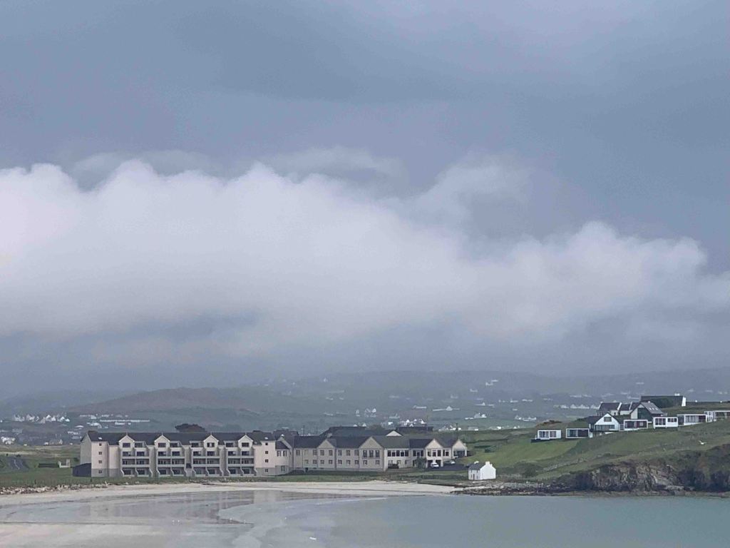 Totally different scene at breakfast this morning……even though all the elements of a FULL IRISH BREAKFAST were available on the menu, you actually had to ask for the punishment rather than having it laid out in front of your nose. Quite a difference……..can you say yogurt with granola and dried fruit, followed by the healthy omelette and……..damn, couldn’t resist……two sausages. Lovely dining room here in the hotel overlooking Downings Beach, the bay (I’ve been telling you Sheephead but it is actually Sheep Haven), and Downings town beyond. Very proper service…….nicely done. We like this hotel. The original, built in the 1890’s was destroyed by fire in the 1970’s. The new one integrates well with the golf operation, and has a classic flavour about it which is nice…….all staff are in black and whites, suits, ties, tablecloths and silverware…….very classy, just like me sometimes.