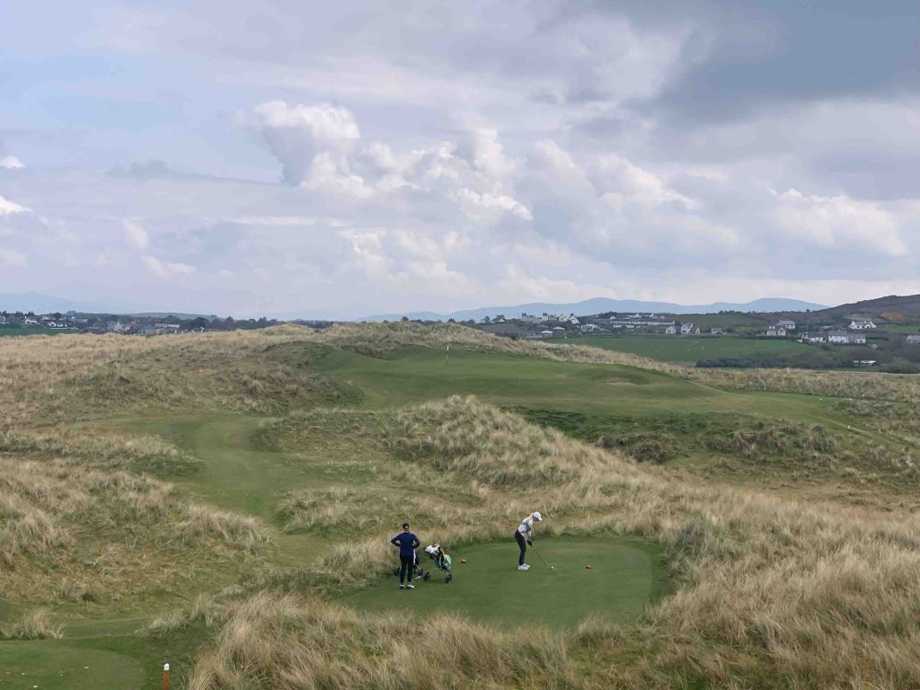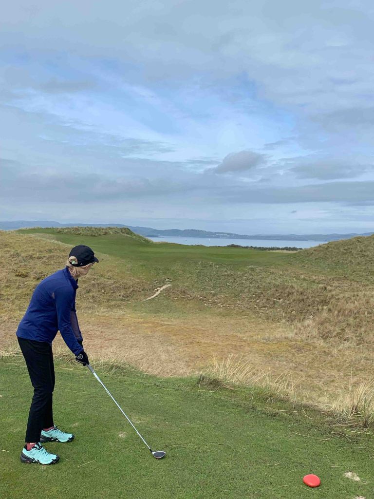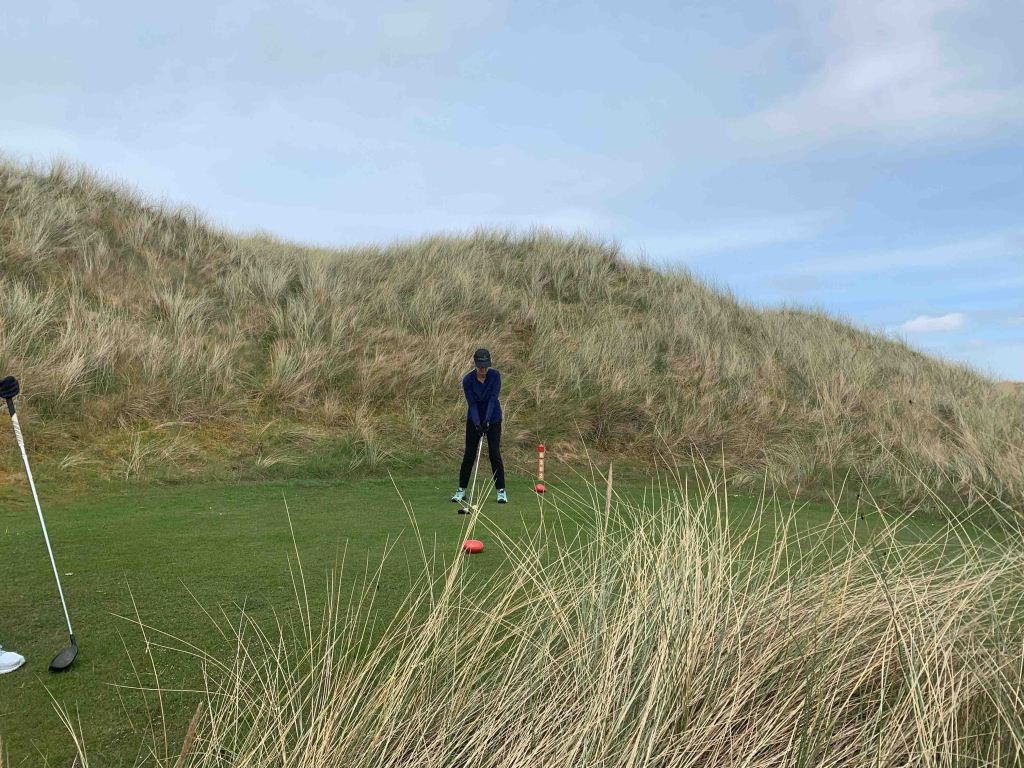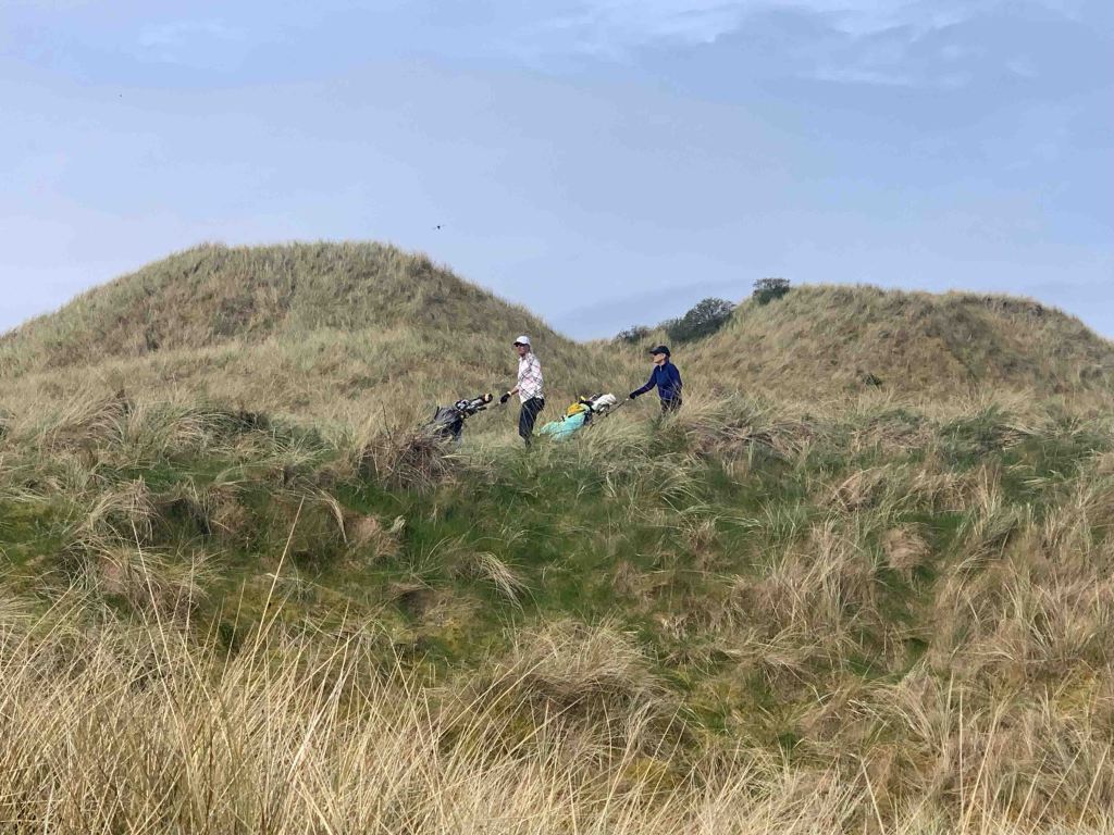 With yesterdays full travel/golf day behind us, we look forward to just golf this morning at the second of the Rosapenna courses, Sandy Hills, probably followed by a trip to town….. “Downings”….. just down the road. Our scheduled tee time is 10:00am, but when we arrive at the pro shop and check with the starter, he tells us we can go whenever we like……….only two groups on course now, and nobody following us for quite a while. We are all over that and feel like we have the entire course to ourselves…….which we do! I grabbed a riding cart from the hotel this morning, knowing that Sandy Hills is up top on the dunes and there are a lot of elevation changes…….giving the knees a break……..Jutta and Sibylle however, are like a couple of mountain goats who could climb all day long………they take trolleys. By the time we reach the second green we are up on top of the dunes, with the Old Tom Morris course we played yesterday visible below us. We stay up there virtually the whole round, enjoying beautiful views and very interesting golf holes. Elevation changes for sure, and my tee boxes are usually above the previous green……..happy to have the cart. J&S are more in their element here that they were on the Old Links, and both agree they would like to play this one again…….me too. It is very important to hit fairways on the longer holes, because if you don’t, you will be tangled in the rough losing major roll yards and leaving massive approach shots. I tried to help Jutta find a wayward shot off the side of a green and sunk knee deep in this spongy grassy moss crap…….don’t hit it there, as you will never find your ball………don’t even look, you could break a leg. I know that golf course pictures don’t always do the course justice, but think there is enough here that you can get the flavour of this one.