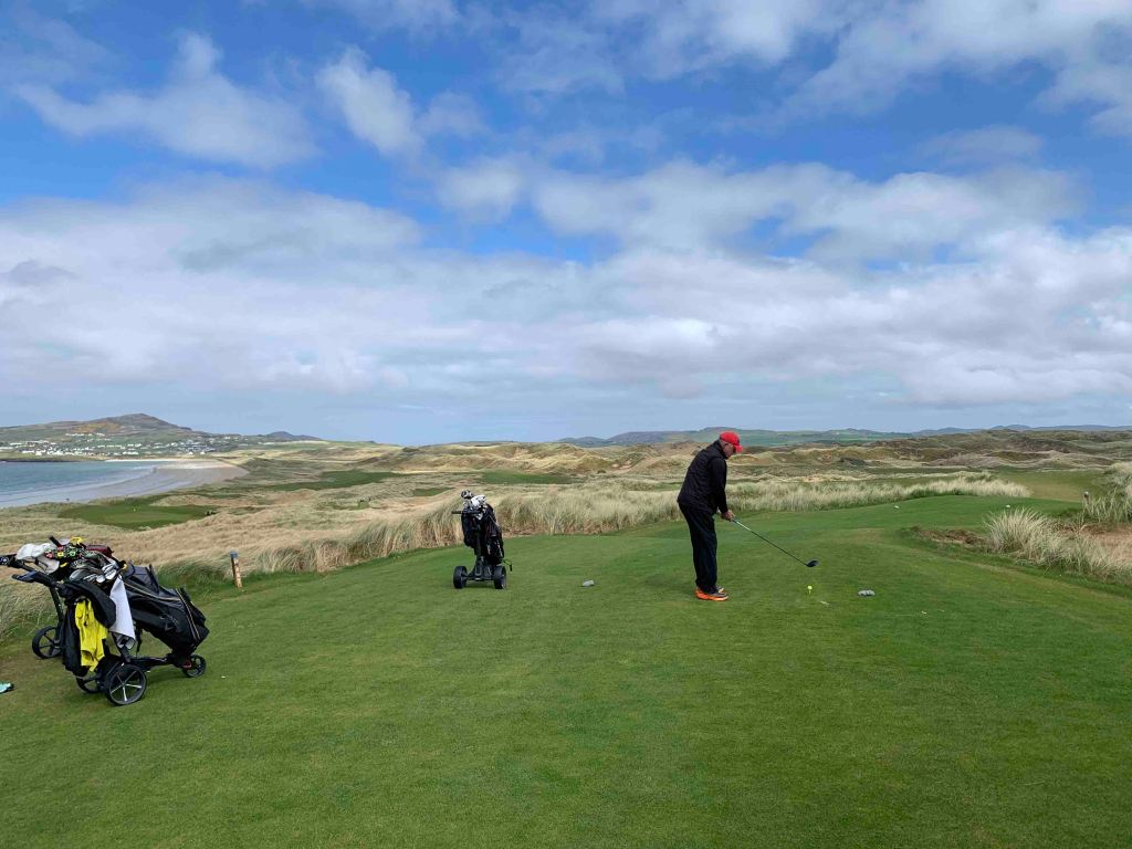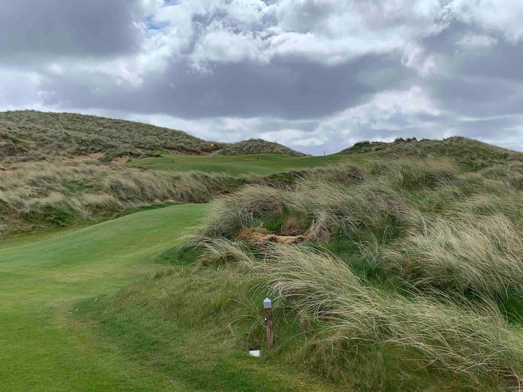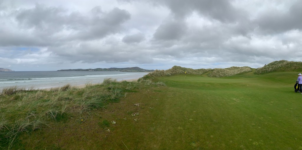 Today we complete the Rosapenna Triple Crown, playing their new course St.Patricks. Located just 4km down the road from the hotel on a vast, dramatic, parcel of dune land, formerly home to a 36 hole golf facility built in the 1990’s. Designed by renowned architect Tom Doak, who has his name on 6 courses in the World top 100. St.Patricks is an absolute beauty and could be one of his best yet. We know Doak’s work from our trip to Bandon Dunes last year when we played his Pacific Dunes and Old Macdonald (Jutta’s favourite at BD), but just Google him and look at the list……….very impressive work. The impact of this course on the entire area could be huge. It debuted at #55 on Golf Mag’s Top 100 and is rated around #3 in The Republic depending on who’s list you look at. The course has already started to draw visitors from around the world and is becoming a must visit course when coming to Ireland. There is no clubhouse yet, but obviously plans are in the works, and the site was chosen with the design of the course. Signs of immaturity can be seen……some say it opened too early……2021……but I am sure it will grow into itself over time. We noticed what looks like poana dotting the course, but it might be some other invasive grass they will have to deal with. Fairways are generally wide and friendly, but they do slope from side to side, and are not without features that will impair your approach shots, making tee shot placement very important……..you can’t just blast it out there onto a big wide fairway. The greens……..holy shit………they say that Doak’s designs are influenced somewhat by Pete Dye, and after playing these greens I would say he was likely sleeping with the guy. Hit your approach shot on the wrong side of the pin and you might roll 50ft away from it…….what am I saying “might”…….I did! Hit it short or long, and you are definitely not staying on. Putting was very difficult because of the contours and slope of the greens, but we also found the speed to be very inconsistent………at least that’s my excuse, and I’m sticking with it. The course turns nicely so you have a mix of winds to deal with………all bunkers are being played as waste areas so you can ground your club………not sure if that will change once they clean up the trap edges, but ground your club or not, some of the traps are just diabolical.
