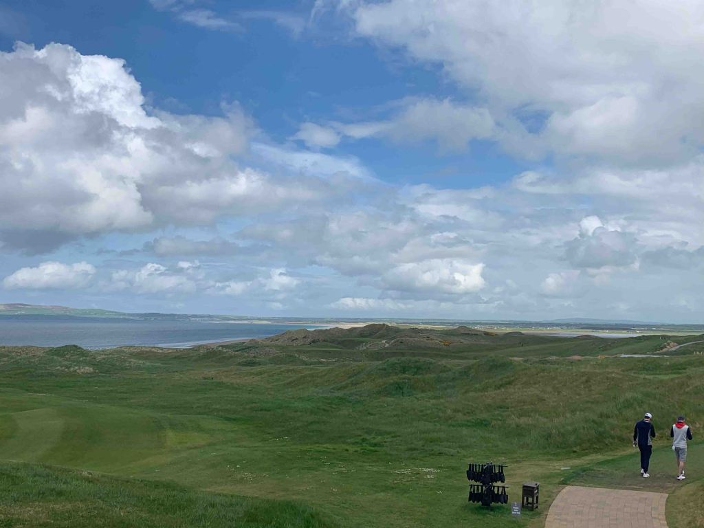 Not far off our route is Ballybunion which we play in a few days, and just beyond that is Tralee……..also on the agenda……so we figure to do a recon and stop for lunch at one of the two. Ballybunion is busybunion…….quite a production with golfers everywhere…….better be prepared for a slow round at this course. A very large modern clubhouse is a bit of a surprise, but I guess that is just a sign of the times. Quick root through the pro shop and we are off to Tralee. Wow……arriving at this property, with the golf course laid out before you and the ocean backdrop, it is stunning. We want to play NOW! Not happening, but we do stop in for lunch, take in the views, pro shop, and head up to the practice area where there is a lovely little stacked sod bunker in the chipping area where we decide to sharpen our sand skills for the upcoming rounds. Ok lets be honest, Sibylle’s sand skills. Progress is made, but to say she has become an expert, or even proficient, would be a lie. But progress is progress and it will only get better.
