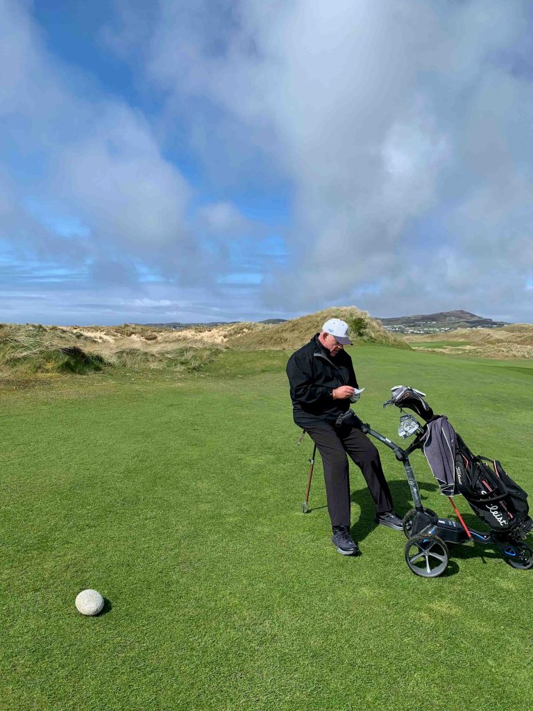 St.Patricks is just down the road from the hotel, and we are there with plenty of time to spare, and actually tee off fifteen minutes early. The course is just stunning…….designed by Tom Doak…….just Google him to see some of his work…….and was ranked #59 in the World right out of the box when it opened in June 2021, and now sits at #49. It is a BIG golf course and requires good length of the tee, proficient shot making, and when the greens are cut shorter this summer, they will be diabolical. The course is quiet and we have nobody behind or in front of us, all day long………perfect. This is a walking only track, and a big test for my injured leg, but I made it through without too much trouble. Pictures of golf courses never really show how great the are, and the pictures below are more of the same. A full on clubhouse and hotel are in the works for the property, and will elevate this entire area to a must visit golf destination when coming to Ireland. There are many other really good courses close by in County Donegal. Scores????……with or without the mulligans????………Jutta very happy with an 87…….Hugh lying through his teeth with an 81.