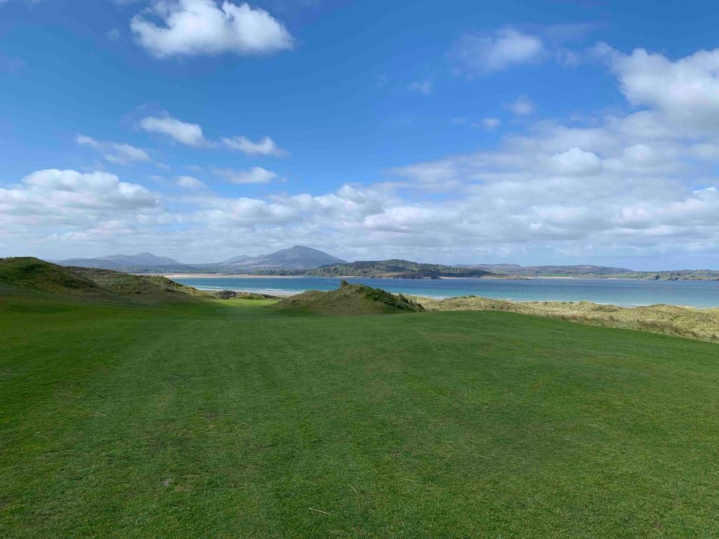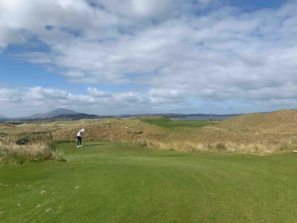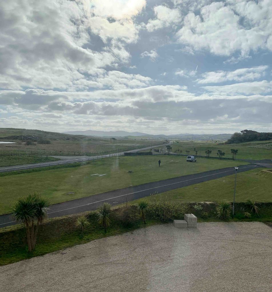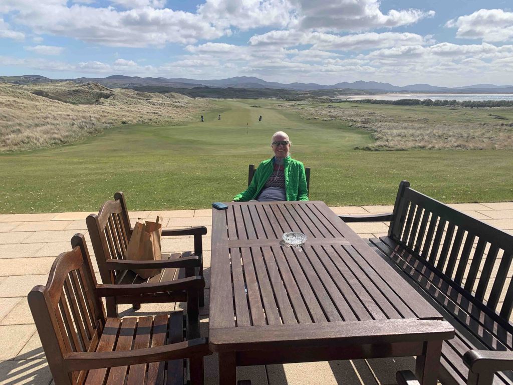 We arrived at the course early, 10:30, and were told we could tee off whenever we liked……..the last group to tee off was at 8:30, and there would be nobody following us for at least an hour or two. Wow……things do appear a lot quieter than when we were here last year, but thinking back, we arrived in Rosapenna probably a week later than we did this year. I don’t know if the flood gates will open next week or not, but having the course to ourselves today was an absolute treat. Sandy Hills was everything we remembered it to be, and more. Just a stunner of a day with bright warming sun and clouds that passed quickly. A little chilly perhaps, but a couple of layers and a light jacket was all that was needed. Each individual hole was all you saw from the tee box, lovely design, and the shape and texture of the holes was phenomenal. I think some of our pictures actually depict what we were looking at for once……..the greens with no backing that seemed to drop off into nothing, actually did drop off into nothing…….don’t hit it long! Scores…….Jutta still stuck on 87…….Hugh, 80, with two doubles on the back…….crap, had a good one going. It was time for our now traditional post round Guinness and an order of chips (french fries), and we sat outside on the patio in the sunshine, with Old Tom Morris looking over us, watching golfers (only a few) come up the 18th.