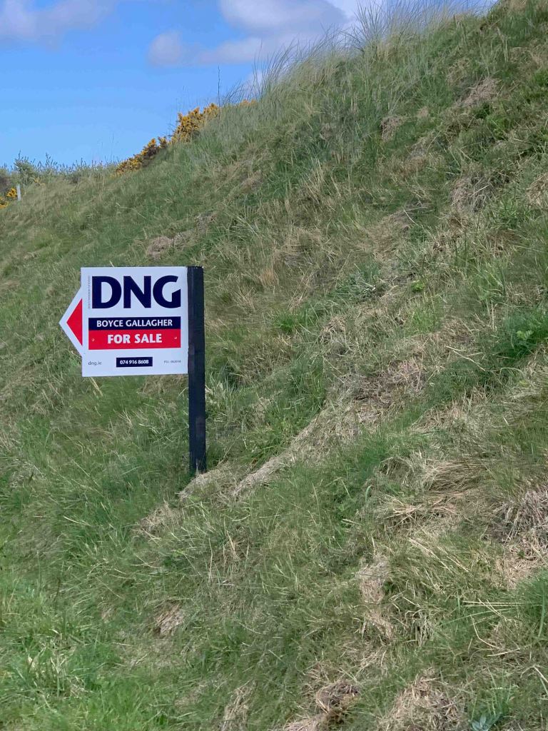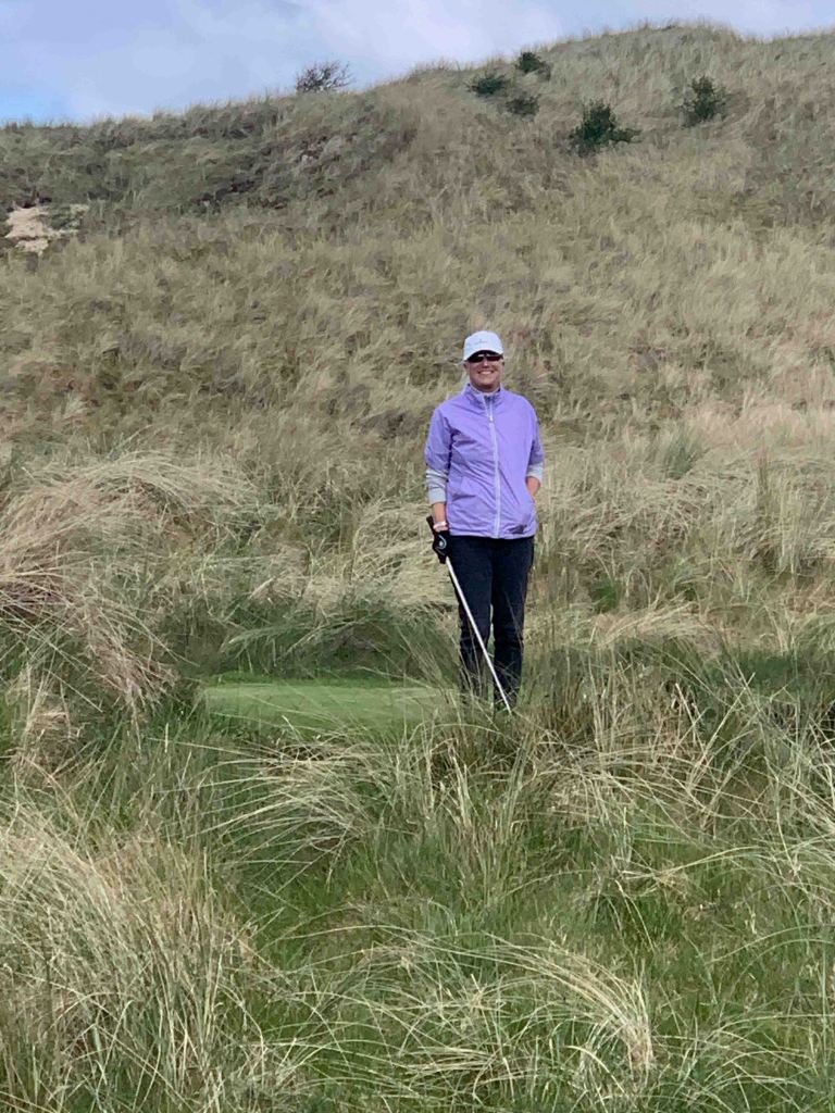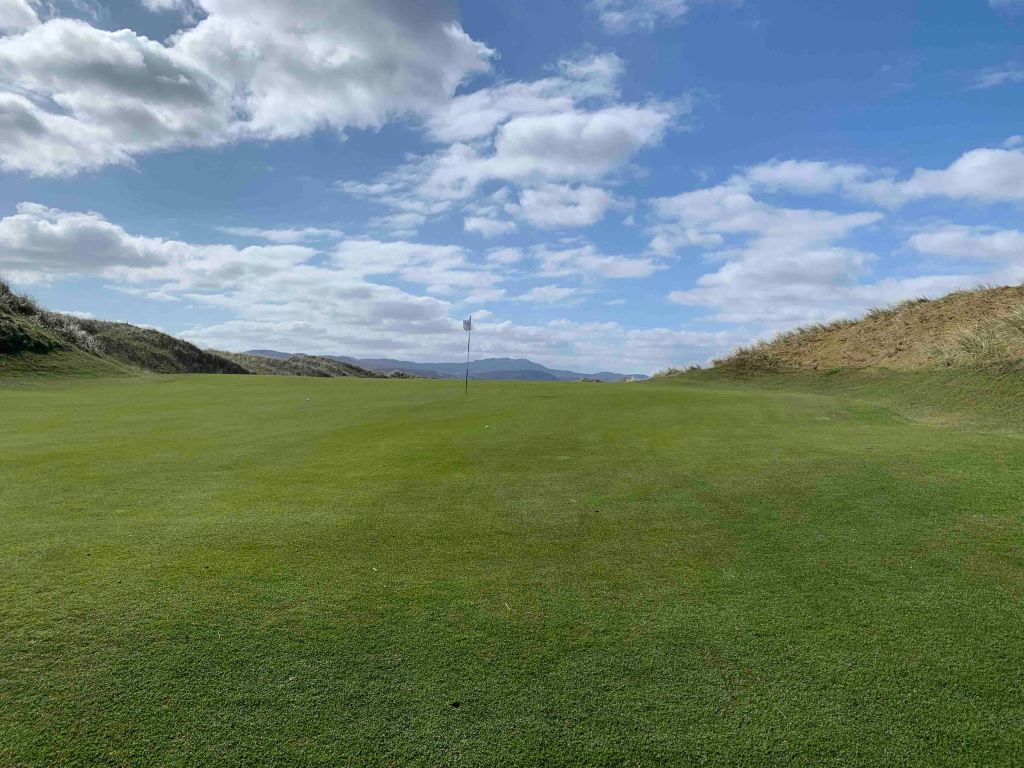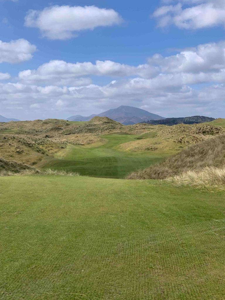 We arrived at the course early, 10:30, and were told we could tee off whenever we liked……..the last group to tee off was at 8:30, and there would be nobody following us for at least an hour or two. Wow……things do appear a lot quieter than when we were here last year, but thinking back, we arrived in Rosapenna probably a week later than we did this year. I don’t know if the flood gates will open next week or not, but having the course to ourselves today was an absolute treat. Sandy Hills was everything we remembered it to be, and more. Just a stunner of a day with bright warming sun and clouds that passed quickly. A little chilly perhaps, but a couple of layers and a light jacket was all that was needed. Each individual hole was all you saw from the tee box, lovely design, and the shape and texture of the holes was phenomenal. I think some of our pictures actually depict what we were looking at for once……..the greens with no backing that seemed to drop off into nothing, actually did drop off into nothing…….don’t hit it long! Scores…….Jutta still stuck on 87…….Hugh, 80, with two doubles on the back…….crap, had a good one going. It was time for our now traditional post round Guinness and an order of chips (french fries), and we sat outside on the patio in the sunshine, with Old Tom Morris looking over us, watching golfers (only a few) come up the 18th.