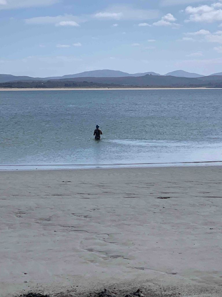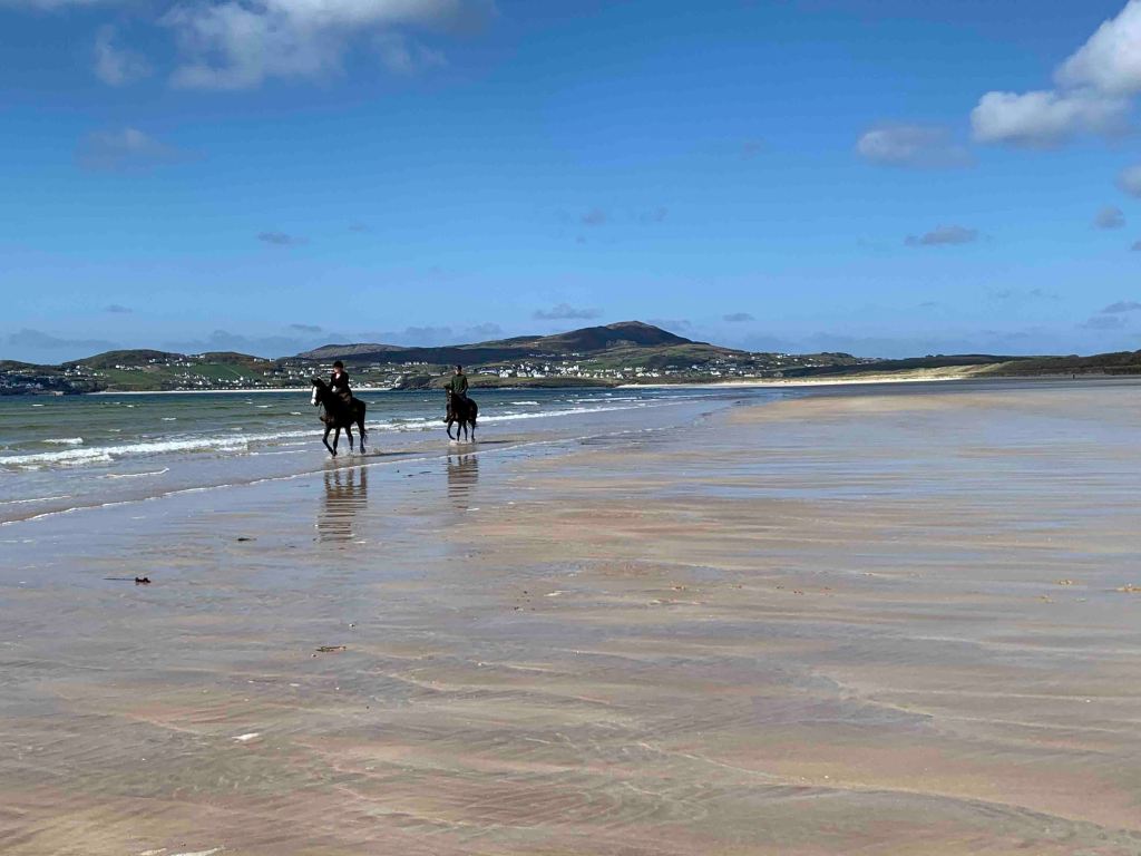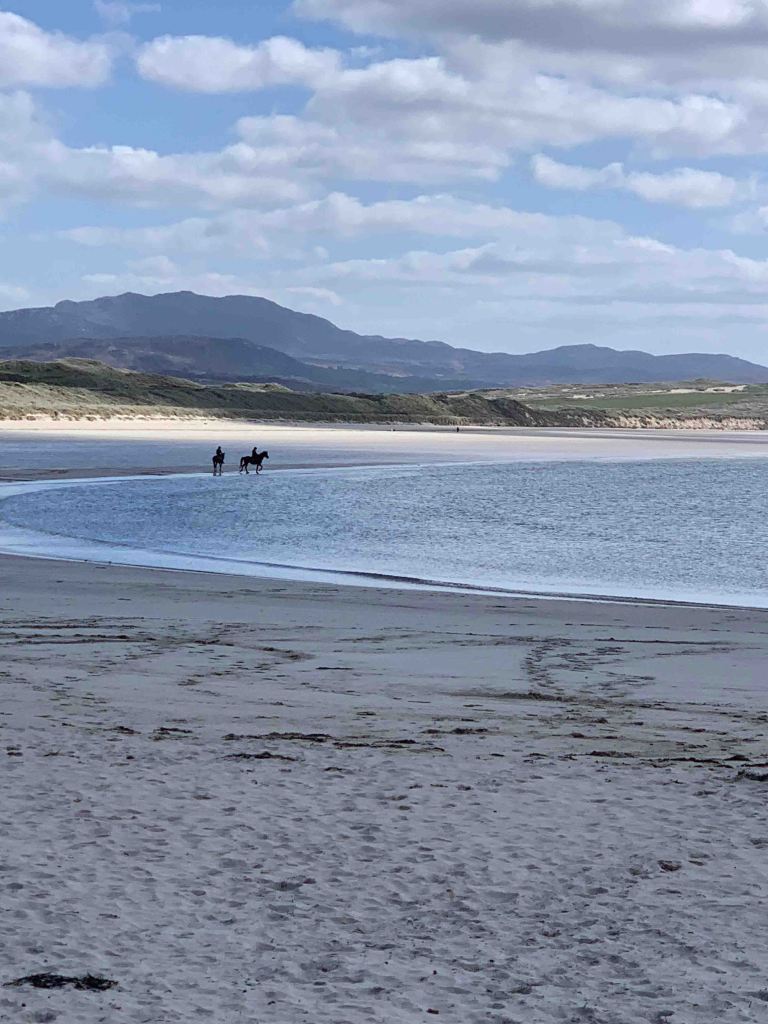 Once finished it was back in the golf cart, and time for a little recon looking for access to Tramore Beach so my beautiful goat could stretch her legs. On the way, we happened to see a For Sale sign pointing to a cottage up the hill so we went and saw it, and bought it on the spot………..kidding……..it was nice but on the wrong side of the street! Jutta was dropped off for her hike, and had a fantastic walk along the shore……..see pictures……..horses in the water……..locals going for a swim…….fantastic.