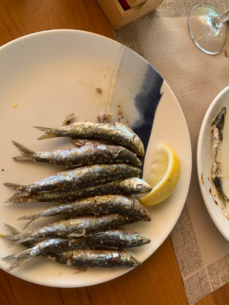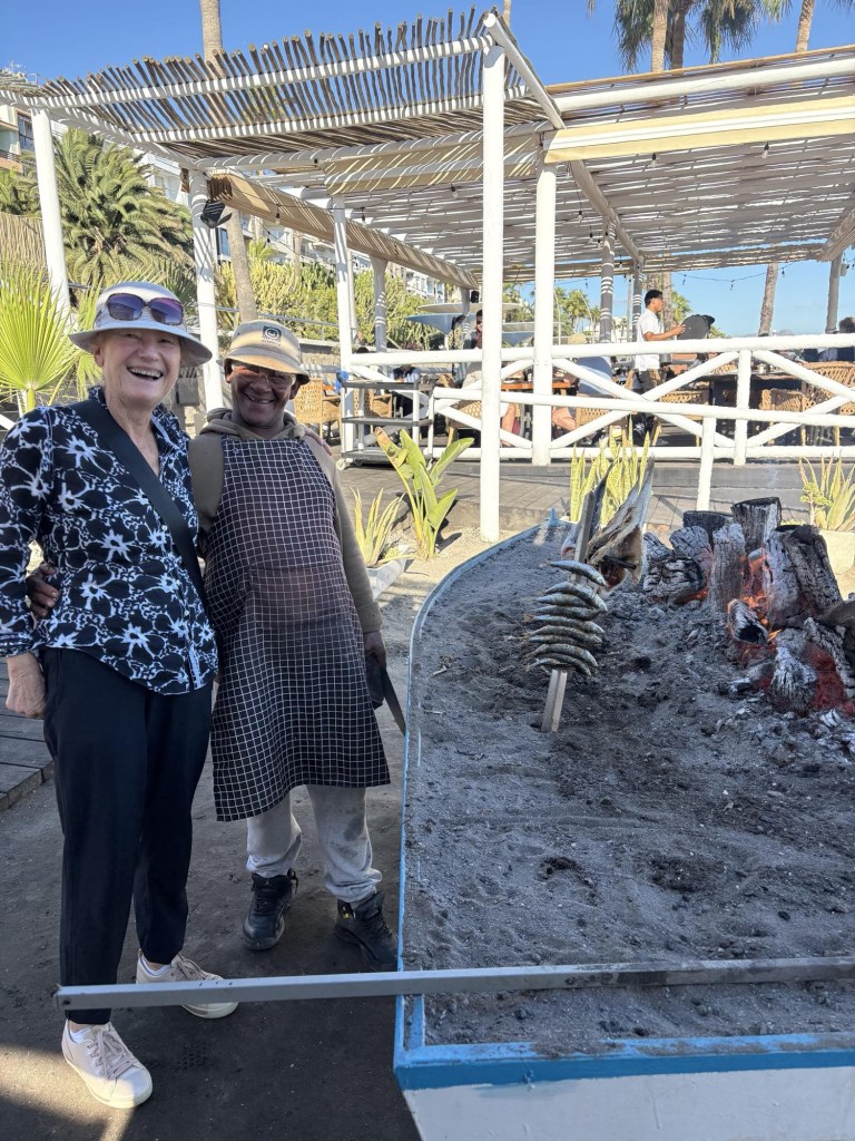 Loving our days off, and I am up and at em for a big ride today……the goats are planning on a walk into town to resurvey the shops and make sure they haven’t missed anything……..don’t want to leave this town when there is a treasure somewhere on a shelf just waiting to be picked up. The plan is to meet somewhere for lunch, and based on previous recon, that would be Central Beach Chiringuito. Many of the chiringuito’s prepare fish on a stick cooked beside an open fire……..takes some skill for sure, and we assume the end result is pretty tasty. J&S show up at Central and I m looking for a place to lock up Wolffy, but watch as the goats decide on one table down at the beach, move to another, then another, then abandon the whole beach seating idea and come up to the inside seating across the boardwalk. Too windy, Too smokey, etc., but now nicely settled inside. Sibylle is all about the sardines…….a throwback to her younger traveling days when she couldn’t afford real fish!!!!, but apparently these are wonderful and as good as she remembers from the wonder years……..Jutta and I are into the sea bass which is totally delish, and washed down with a few San Miguel’s we couldn’t be happier.