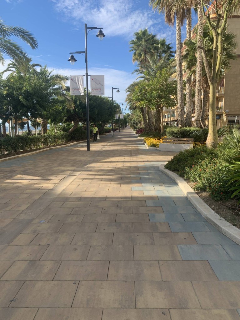 It’s a no golf day today, and no surprise that Jutta and Sibylle are taking Monica to La Canada for yet another run through the stores. John and I will cover some ground this morning…..he on foot, and me on Wolffy, and will hook up at Las Ninas for some of their great coffee and a breakfast sandwich. Temperatures are getting a little nippy overnight, and it doesn’t truly warm up until the sun gets a little higher in the sky, but still ok in shorts on the bike. I have become somewhat of a regular at Las Ninas, and barely need to order my cafe con leche anymore…….the waitress gives me the look, and I give her the nod, and she steams one up for me. I also notice that I am getting my coffee served in a glass like the locals rather than the cup and saucer I had for the first two weeks………good either way……..they do make great coffee here in Spain.