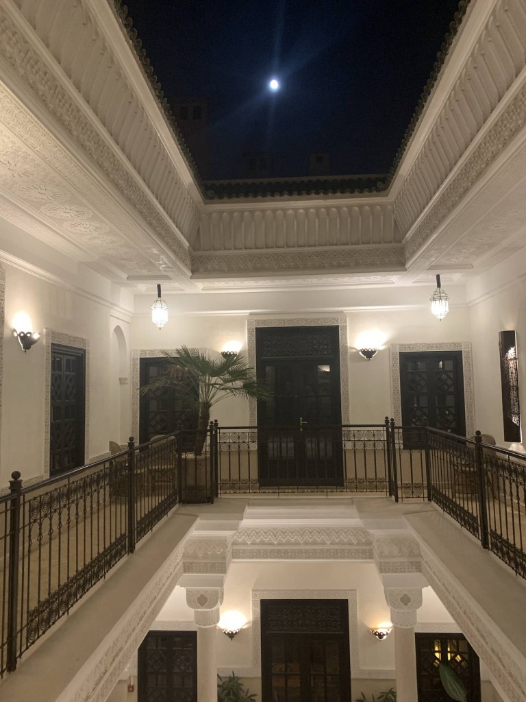 Funny moment when the GPS says we have arrived, and we look around thinking, hey we booked a nice hotel here, but it is nowhere to be seen. We see an auto repair shop with a car up on a floor jack at the side of the road getting worked on, and a motorcycle repair shop, with similar work going on out front on the sidewalk………..then we notice a couple of palm’s in planters at either side of a double wood door, and we realize we have actually arrived! Villa des Orangers, comes highly recommended from Myrne, who stayed here with Pete on their trip, but they didn’t fill us in on the stunning curb appeal this place offers……..what a hoot…….bags out of the van, and an army of staff arrive to ensure we don’t touch a thing, and we stroll down a long hallway past the front desk and into an courtyard oasis where the registration is handled.