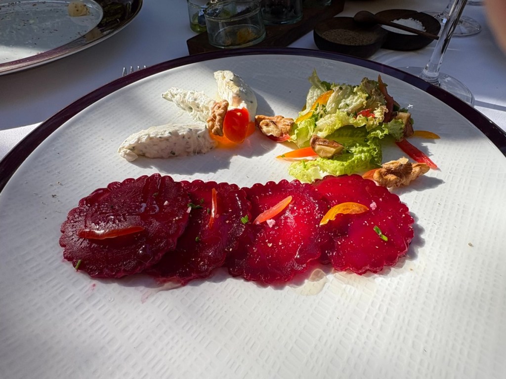 Early tee time = home in time for lunch…….good thing we made it back today because the chef has prepared a special treat for Jutta……..she has been raving about the beet ravioli dish that was a chef’s special on the lunch menu a few days ago, and he/she has prepared one especially for her. I mean where else would you get that kind of attention. We all make busy after lunch packing away the clubs and loading the suitcases hoping all the booty will fit in…….I have a new pair of pointy toed slippers that are absolutely special, a shirt from Akenza, and a couple of hats……..this list is minuscule when compared to the haul taken in by the goats, and holy crap, the Cosgrove’s had to buy another suitcase to go along with the two sea chests they arrived with. We always like to support the local economy!