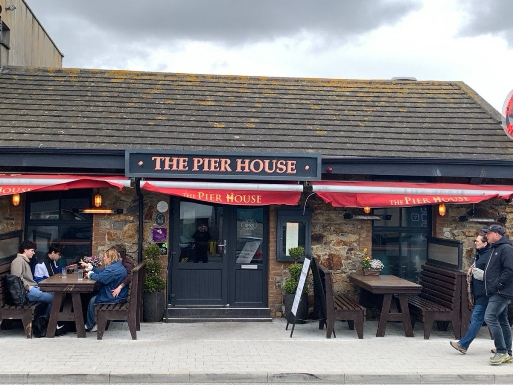 Following golf, I suggest we might scoot down the coast a little to Howth, the primary town on an interesting peninsula jutting out into the sea, and helping shape Dublin Bay. Howth is well known for its hiking trails along the cliffs, the commercial fishery, many restaurants, and touristy shops. It has a huge long pier that is well travelled by walkers, hikers, and bikers. What a great vibe here……..loads of people all over, and more fish and chip shops than you can imagine……..all advertising the freshest fish ever………yeah, they caught it next door just this morning! Tons of parking, nicely organized, and get this, it’s free……..what a concept. We just can’t resist all this food, and it is well past feeding time for the goats anyway, so we decide on The Pier House, largely because we are standing in front of it at the time. Inside we meet Jacob, our waiter, a large bearded, tatted up, Polish guy, who talks us into a bottle of wine rather than glasses, and suggests a few appies to tide us over until dinner. Really hit the spot, and after overhearing the neighbouring table say this was the best fish and chips…….EVER…….we decide we are coming back here sooner than later. We just happened to have eaten some of the best shrimp tempura…..EVER…….so if you are EVER in Howth, this is the spot. We tour the town a little in Cash Cab, spot a golf shop, talk to a local about the trail system, and discuss plans to return here tomorrow for a hike.