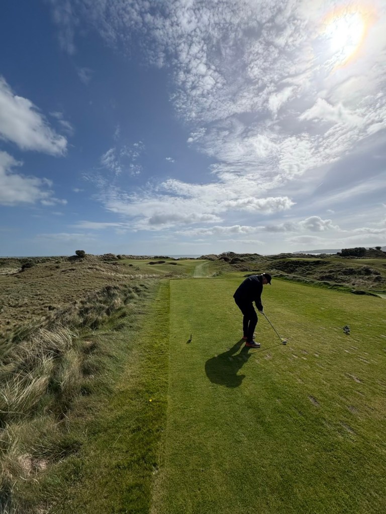 There is no starter today, so we self manage ourselves at the first tee, choose our tee boxes, and we are off……I am playing 6,300yds (next choice up was 6,800…..nope) and the goats are off 5,500 which should be manageable except for the wind which is howling in our face off the Irish Sea……the pro mentioned it would be “breezy” today……..you have to love the Irish!