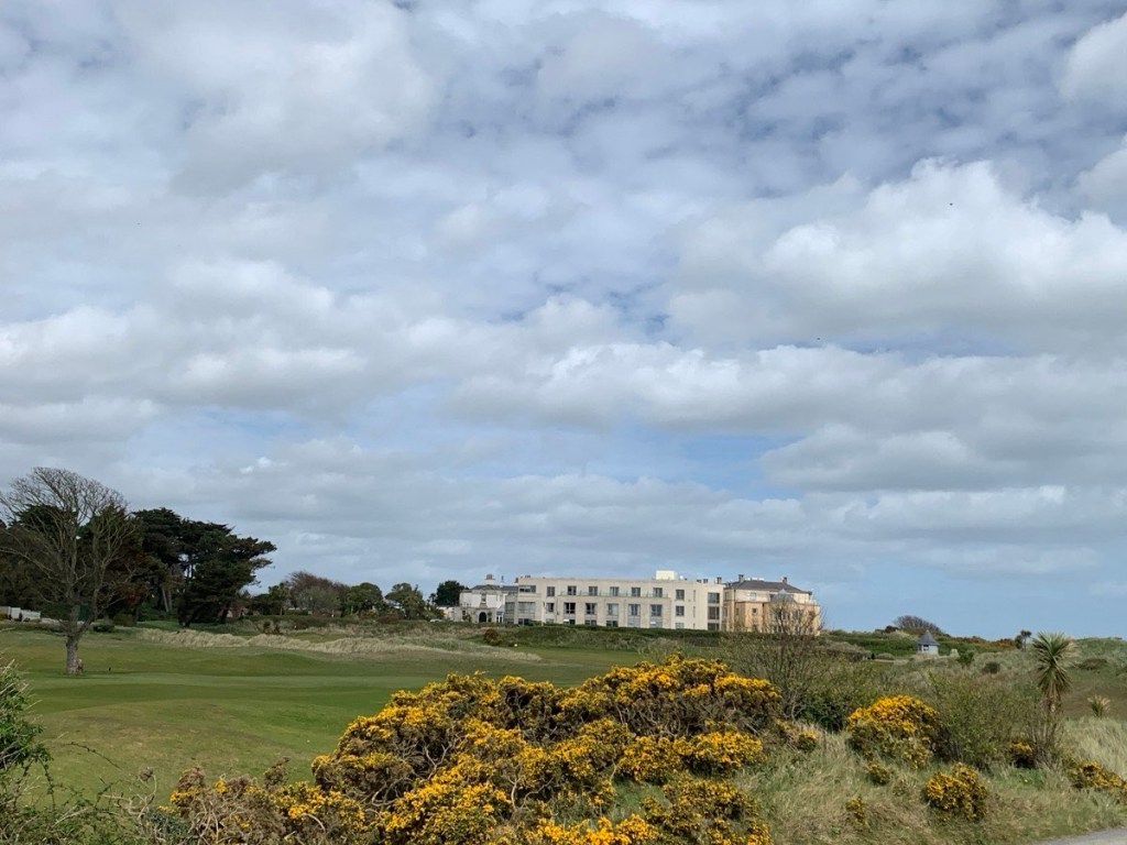 I found the Portmarnock Hotel very difficult to navigate upon my arrival a couple of days ago, and even more so with the ladies yesterday. Arriving with a golf travel bag and suitcase each, there is no easy way to get to the reception desk without taking on sets of stairs both outside and inside the hotel. No doorman except on weekends during the shoulder season, and the concierge is a woman easily my age or more, so I wasn’t asking her for a hand either. Once you clear that hurdle and want to golf, you have to get to the golf shop, outside on the extreme other end of the hotel, load up your clubs, and then go back the length of the hotel through two parking lots before getting to the practice greens and first tee. We developed a system where I would go to the golf shop and pick up my cart…….drive back to the front door, where the goats have used a luggage cart and the handicapped lift to get down to ground level with the bags…….I take them to the golf shop and load their PowaKaddy’s and we are good to go. What a production, and the club doesn’t have storage available at the golf shop, so we do this daily. I don’t think a lot of thought went into this design. BTW the prices in the golf shop are through the roof!